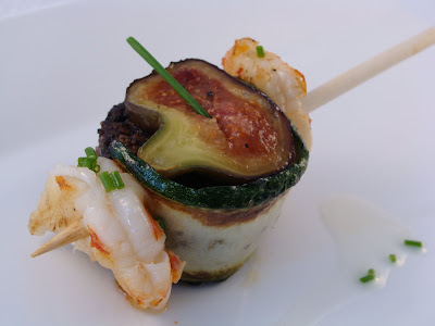 Pinchamos una gamba, la morcilla de lado y la tira de calabacín la enrollamos en la morcilla, a mi no me dio la vuelta) ponemos la otra gamba y el higo encima.